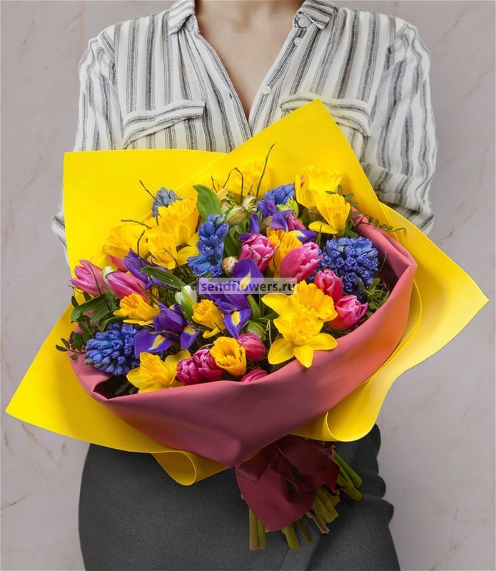 Состав: Ирис синий (5), Нарцисс (18), Лента натуральная (4), Черничник (10), Фисташка (7), Альстромерия розовая (1), Альстромерия красная (1), Альстромерия белая (1), Альстромерия желтая (1), Гиацинт синий (5), Тюльпан ярко-розовый (9), Фоамиран (3)